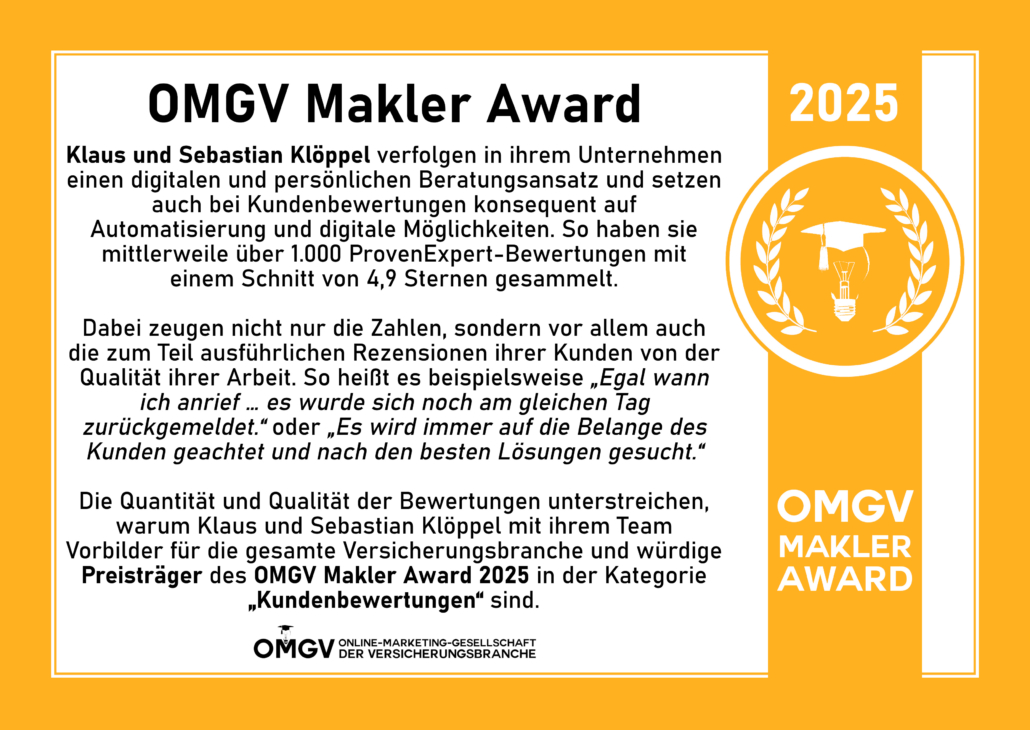 Klöppel Versicherungsmakler gewinnt den OMGV Makler Award 2025 in der Kategorie „Kundenbewertungen“ 🏆